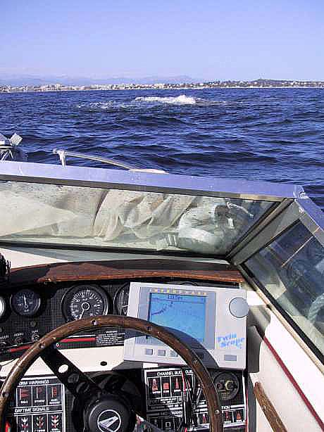 partie du Vue de mon ancien bateau, le Miramar II, avec son sondeur balayant vers l'avant, le "Forward Looking Sounder" FLS Twinscope by Interphase